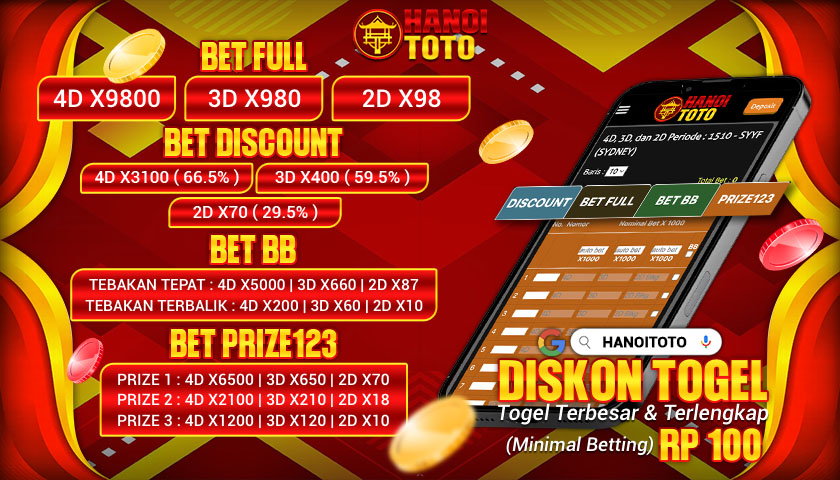 SELAMAT DATANG DI HANOITOTO - BANDAR TOGEL, LIVE CASINO & SLOT ONLINE TERGACOR DI INDONESIA - Nikmati Diskon Togel Terbesar 4D: 66.5% | 3D: 59,5% | 2D: 29,5% - Bonus Cashback Turnover Live Game 1% - Layanan Transaksi Bank 24 Jam Tanpa Offline. Minimal Deposit IDR 10.000,- dan Withdraw IDR 25.000,-